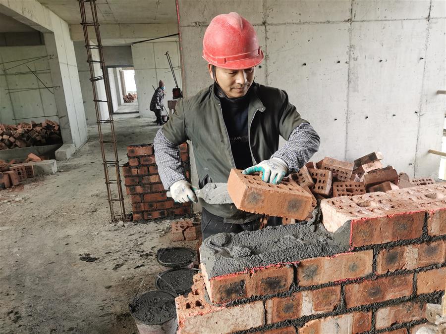 柳城靖西村棚戶區(qū)改造項(xiàng)目建設(shè)者在砌筑