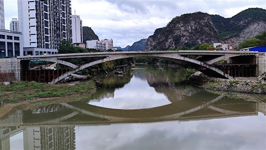 河池市龍江六橋(輝樂橋),全長211.19米,其中主橋長128.10米,凈跨徑90米、凈矢高13.50米、橋總寬26.5米。