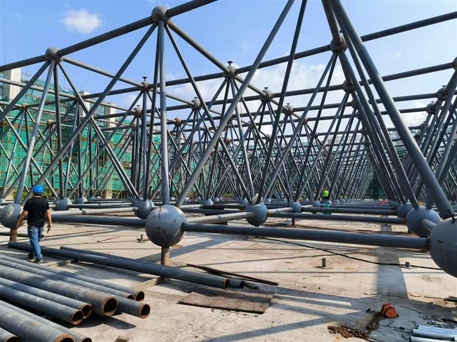 項目正在進(jìn)行鋼網(wǎng)架電焊、焊口除銹、焊口探傷檢測、鋼球補(bǔ)漆等鋼結(jié)構(gòu)施工。為確保項目順利推進(jìn),項目部倒排工期計劃并及時根據(jù)現(xiàn)場情況更新安排,配足人力機(jī)械,加班加點(diǎn),齊心協(xié)力,全員投入推進(jìn)項目建設(shè)。目前,已完成拼裝任務(wù)的50%。